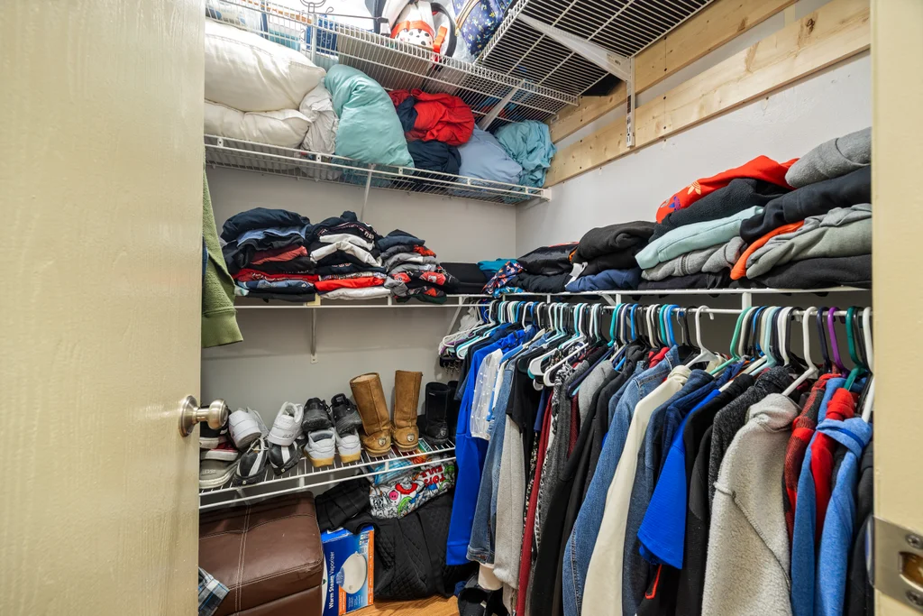 Bright living and dining space with wood-burning fireplace and access to one of two private patios. The kitchen offers abundant cabinetry, pantry storage, with a second patio door overlooking open green space. In-unit laundry and interior storage add everyday convenience.